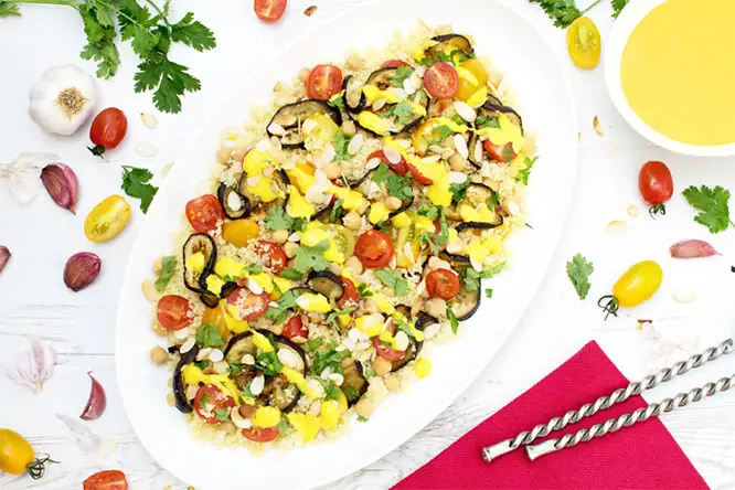 This colorful Roasted Aubergine Saffron salad will impress your guests. This salad is ready in just 30 minutes, making it perfect for a barbecue, buffet or outdoor dining.