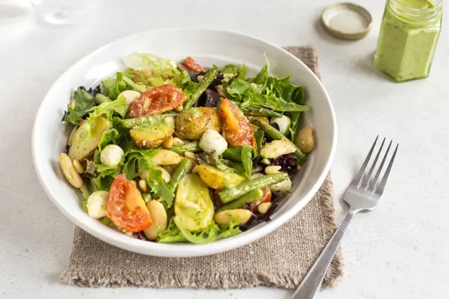 This vegetarian salad is full of textures and flavours, but it also contains a lot of protein. Imagine crispy roasted potatoes, crunchy green beans and fat butter beans. Not to mention roasted tomatoes and mozzarella pearls. This is not a boring salad with its wonderful ingredients!
