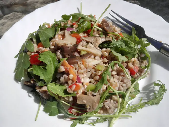 Gluten-free buckwheat salad with mushrooms and rocket