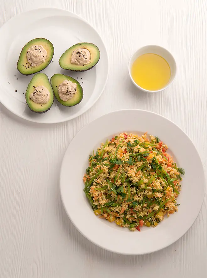 Warm millet and avocado stuffed hummus