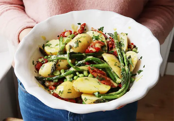 Madeleine Shaw has created another potato salad. Madeleine re-imagined a classic potato dish by adding asparagus and peas. The dressing is tangy and goes well with potato and asparagus. Sundried tomatoes add a little extra flavour.