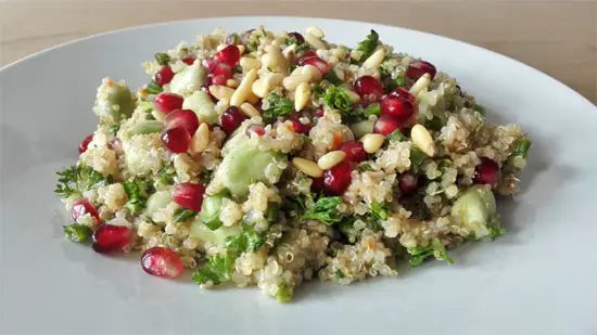 Another of my creations is Herby Quinoa Salad. This is the best salad I have ever made. This salad is so tasty and nutritious. I added pomegranate and sweet parsley seeds to give it a fresh taste. This whole combination is incredible. I sprinkled pine nuts over the top to give it a little extra crunch. It’s delicious!