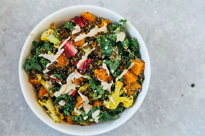 Salad of Quinoa & Roasted Veggies with Tahini Garlic dressing